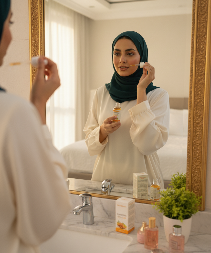 "كنت دايمًا أحاول أخفي البقع والمسام بالمكياج، بس ما كنت مرتاحة. من أول أسبوع مع زيت الكركم الطبيعي لاحظت فرق حقيقي، بشرتي صارت أنعم، لونها متجانس، وصديقاتي يسألوني وش سويت! أحس رجعت لي ثقتي وجمالي الطبيعي بدون مجهود."